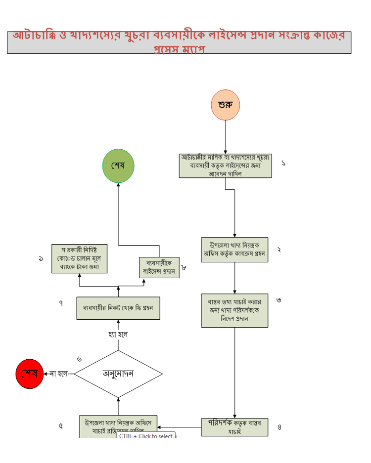 | ৮ | আটাচাক্কি ও খাদ্য শস্যের খুচরা ব্যবসায়ীকে লাইসেন্স প্রদান সংক্রান্ত কাজের প্রসেস ম্যাপ | দেখুন |